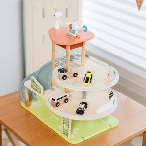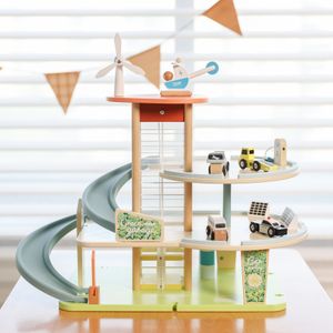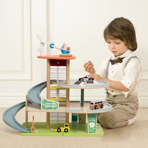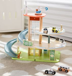 CLASSIC WORLD Drewniany Garaż XL "Eko Strefa" 🚗🌱 to 3-poziomowy parking z windą, stacją ładowania, panelami fotowoltaicznymi, wiatrakiem i 4 drewnianymi pojazdami.