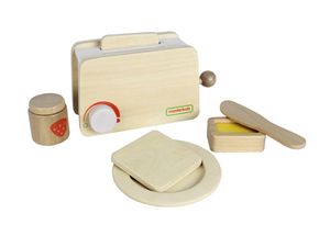 🍞 Drewniany toster Masterkidz z dodatkami (masło, dżem, kromka, nóż, talerz) pozwala dzieciom w wieku 3+ samodzielnie przygotowywać śniadania 🍓🧈🥪, ucząc się zabawy i podstaw gotowania 👶🍽️.