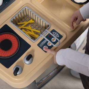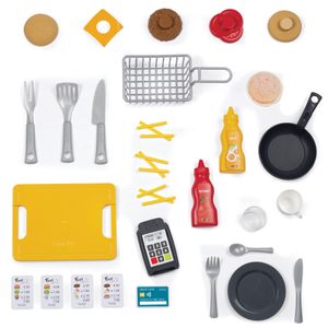 Bar Szefa Kuchni 🍔🍟 to zestaw dla dzieci 👧🧒 do zabawy w gotowanie 🍳🥘 i obsługę klientów 💰💳, z lodówką 🧊, piekarnikiem 🍪, frytkownicą 🍟, zlewem 🚰, ladą 🍽️ i 29 akcesoriami 🍳🔪🥄🥤🍔🥞.