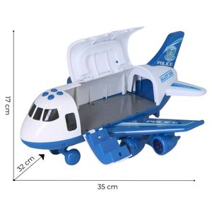 Interaktywny samolot policyjny WOOPIE to transporter pojazdów z otwieraną klapą, rampą i schodami, wyposażony w generator pary wodnej, migające diody LED, dźwięki syreny i strzałów oraz praktyczny uchwyt, idealny dla dzieci od 3 lat (35×32×17 cm).