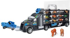 Woopie Samochód Transporter Dinozaury Ciężarówka to zestaw 3w1, który zawiera ciężarówkę, 6 dinozaurów, 6 zwierząt, mały samochód i helikopter, a także funkcje lawety, walizki i wyrzutni do przechowywania i transportowania pojazdów oraz zwierząt.