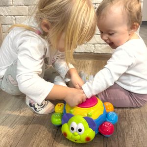 🐞 WOOPIE Interaktywna Biedronka do Raczkowania 🚼 ucieka i zachęca maluszka do pierwszych kroków, każda nóżka ma inny kolor 🌈 i zwierzątko 🐶🐱🐸🐵, po naciśnięciu wydaje dźwięk i nazwę w języku angielskim 🗣️, a bębenek na grzbiecie 🥁 świeci 💡 i gra, rozwijając motorykę, koncentrację i umiejętności poznawcze.